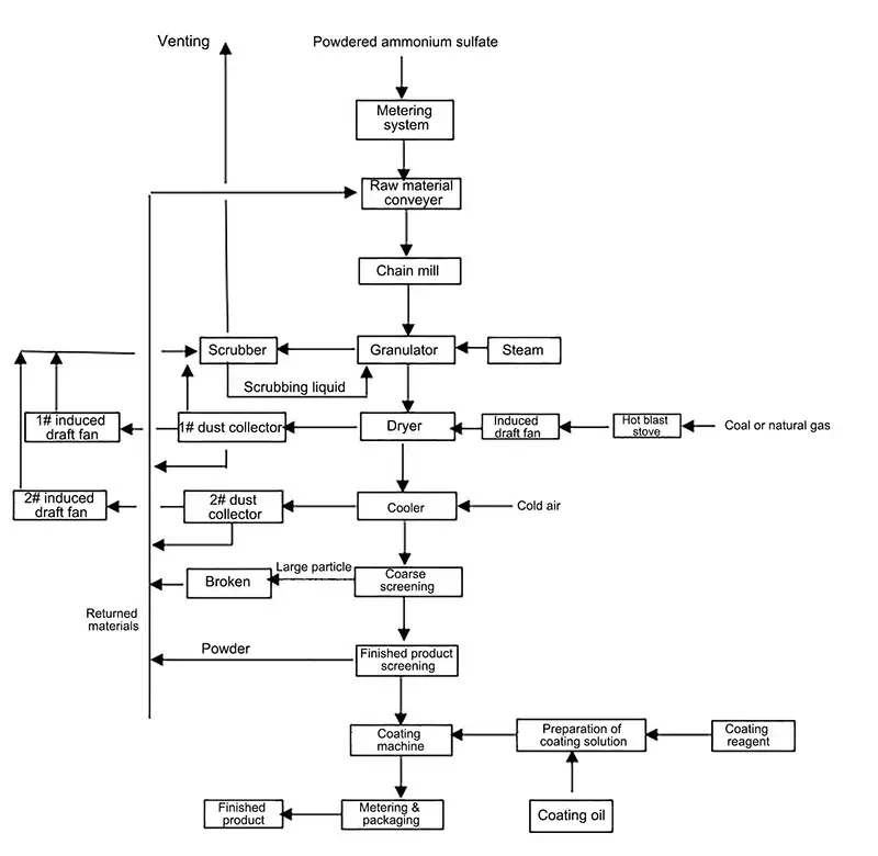 تعالج مادة التحبيب بعد ذلك بالتجفيف والتبريد والغربلة والطلاء السطحي والتعبئة، لإنتاج حبيبات كروية من كبريتات الأمونيوم.
