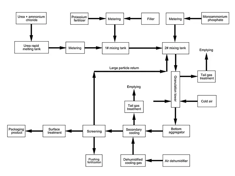 يعتمد في خط الإنتاج هذا عملية تقنية التحبيب باستخدام بالعجينة المنصهرة في برج منخفض لإنتاج أسمدة مركبة حبيبية أساسها اليوريا. يستخدم منصهر اليوريا أو محلول نترات الأمونيوم والفوسفات كسائل ناقل، ويخلط مع أسمدة الفوسفات المسحوقة وكلوريد البوتاسيوم أو كبريتات البوتاسيوم لتكوين خليط متجانس. يرش المخلوط من فوهات التحبيب في أعلى البرج، ويتصلب بالتبريد، ثم يغربل ويغلف ويعبأ لإنتاج حبيبات ناعمة مستديرة ذات قوة ميكانيكية عالية.